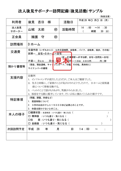 サポーター活動の紹介 山城権利擁護ネットワークのサポーター養成講座修了後、サポーター登録して頂いた会員には、受任検討委員会により随時担当が決定され、正会員と組んで、活躍して頂くことになります。 サポーターには下記のような報告書を作成して頂き、支援内容や活動実績等の情報が共有され、適正な支援活動が担保されるよう配慮しています。